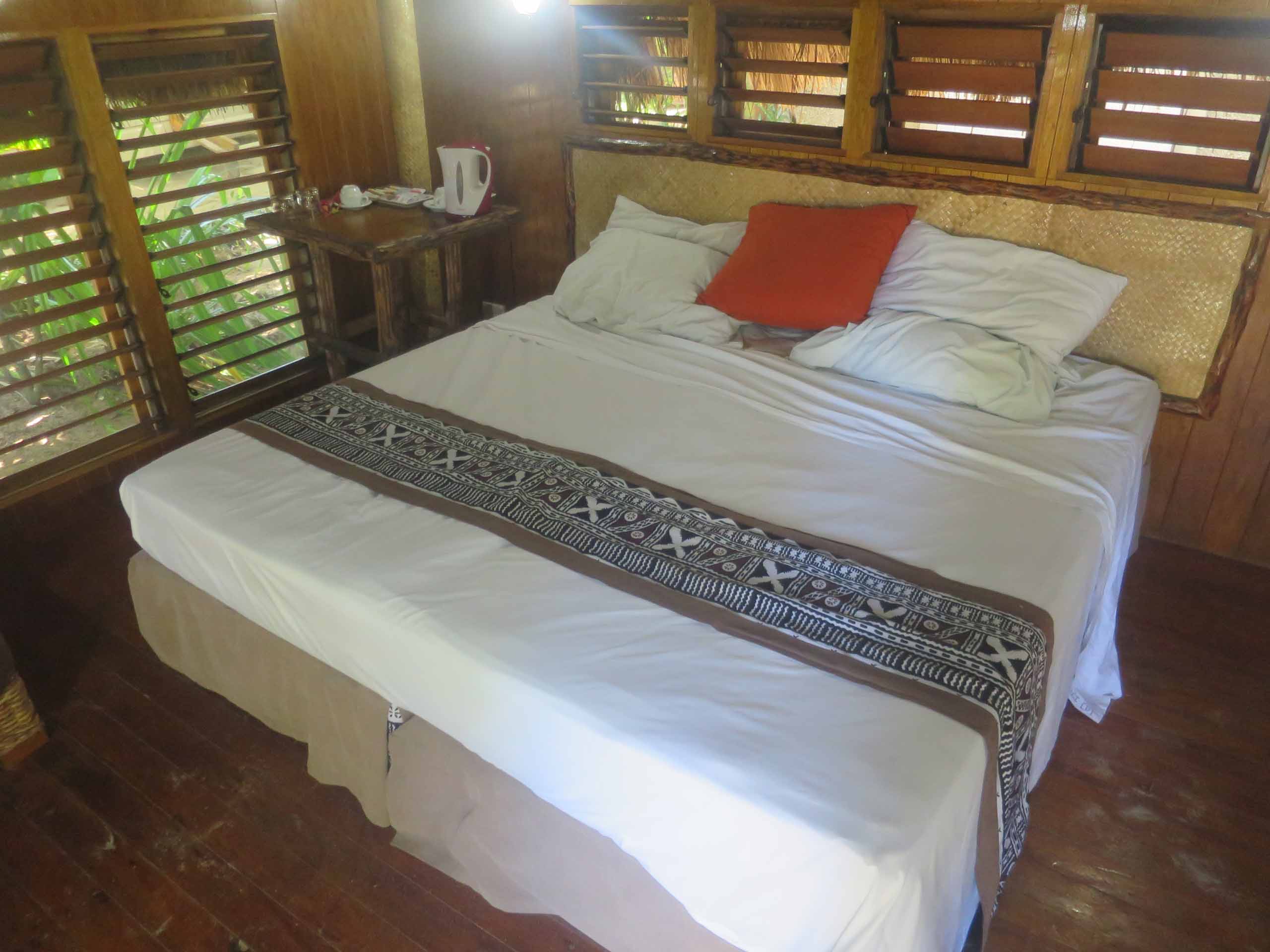 Nosotros nos alojamos en los Bungalow Levu. Eran unos pequeños bungalows en los que tenías una cama grande, una mesa y espacio para dejar tus cosas. Fuera tenían unas sillas y una mesa y detrás del bungalow estaba el baño con ducha. El baño tenía a favor que era privado, pero lo malo es que estaba fuera, separado de la estancia principal lo cual era un poco incómodo a veces.